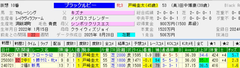 相手も当然ながら3歳馬でいいだろう。他にはドゥカート、ブラックルビー、リアンベーレの3頭がスタンバイ。何も考えないで買うなら4点で終了もありじゃないかな。だって予想するの面倒だしさ。