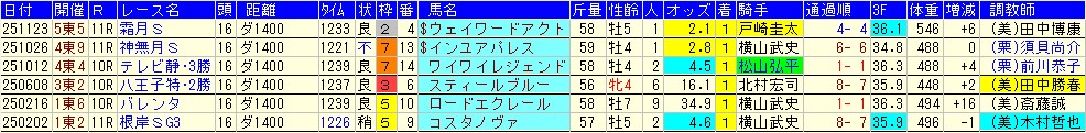 G1や関西圏で苦戦しているのは毎度のように指摘しているが、東京のダートで好成績を残していることは百も承知。記憶にとどめておくのと、こうしてファクトを見るのとで誤差が修正できる。馬質的に優遇されているから武史狙いは普通に成立しそう。