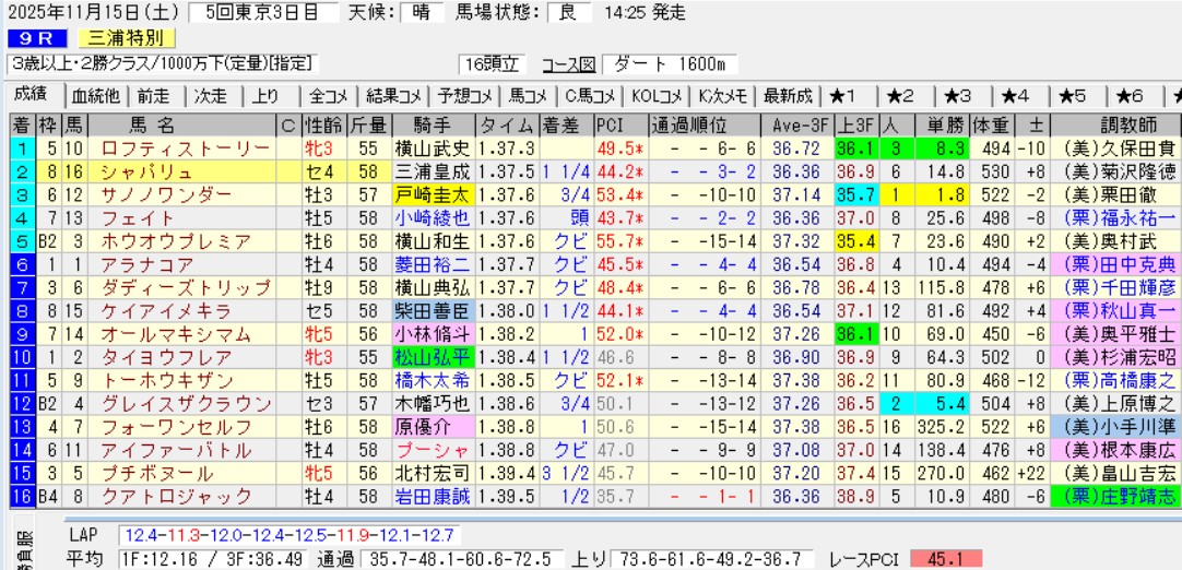 ゴ三浦師匠のシャパリュは、ダ1600で使った前走の三浦特別(2勝)がよかった。外目を先行して勝ち負けまで持ち込んだが、最後の最後に捕まっただけ。前傾の厳しいラップを積極的に乗って、断然人気のサノノワンダーに先着したのは評価したい。