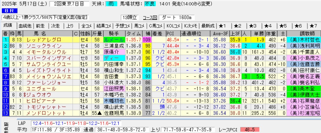 最後にレッドアレグロの話に戻そう。前走の楽勝は展開と馬場のプラスアルファが大きい印象。2着ソニックラインは、その後も4連敗。3着イモータルソウルもまた1勝クラスで頭打ちだ。
