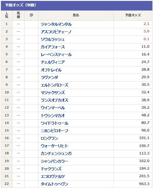 例の如く某キチガイ掲示板の予想オッズを参考にすると、ジャンタルマンタル、アスコリピチェーノ、ソウルラッシュの三強想定となっている。いずれもトップクラスの実力を持つだけに、この3頭であっさりというケースも考えておきたい。
