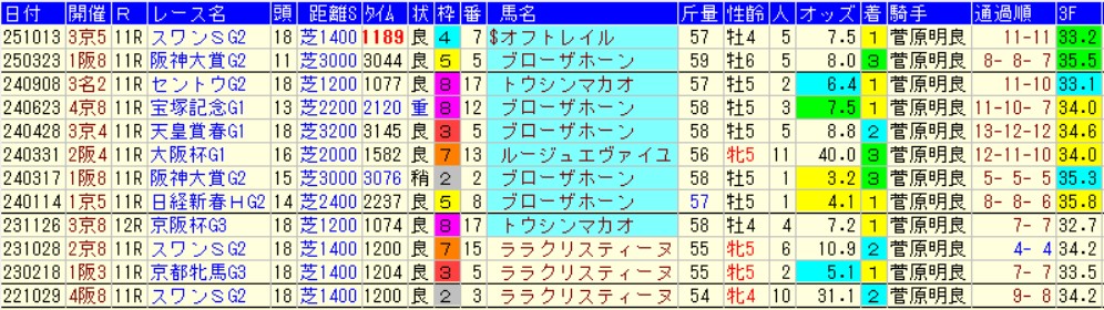 何といっても特筆すべきは菅原明良の騎乗。武史と違って明良は関西圏の重賞で圧倒的な好成績を残しているのだ。初G1制覇もブローザホーンの宝塚記念(G1)だったよね。