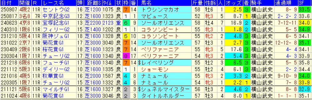 横山武史の関西圏重賞(3.4.7.44/58、勝率5.2%)