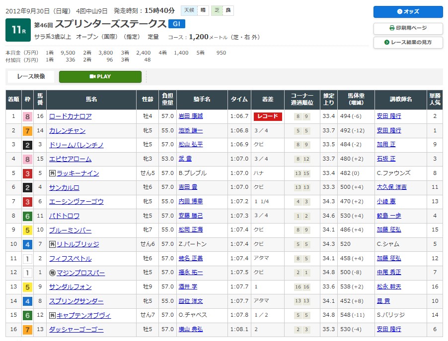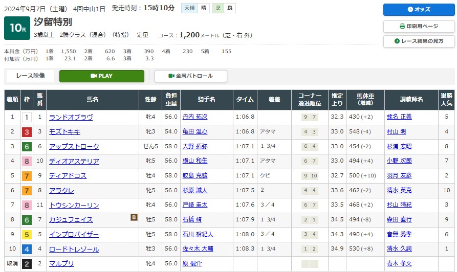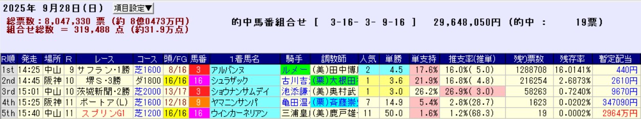 ラストのウインカーネリアンはゴ三浦師匠にすべてが味方した大波乱。造園課が魔改造しまくっている秋の中山で公正競馬なんかできるわけもなく、馬なりで走れそうな33秒7-33秒0の1分6秒9で決着した。
