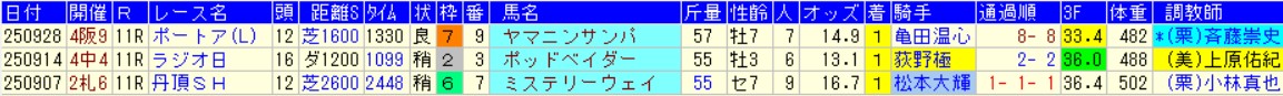 ラストの紫苑Sは行く馬が行かずに、たまたま前にいたケリフレッドアスクがそのまま逃げ切り。位置取りと仕掛けの遅いルメールが、直線の長い新潟ボケしていたのではないかと疑う決着でもあった。
