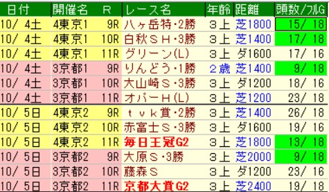 これを踏まえると今週の京都大賞典も毎日王冠もG1馬の出走はなし。あ、ドゥレッツァは菊花賞馬だけど関西の武史で怪しいねってのはあるか。