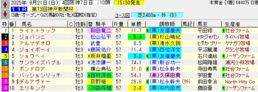 気合を入れて予想したのは前半3つだから、神戸新聞杯(G2)は手抜きしてもいいんじゃないかな。手コキみたいなもんだ(違