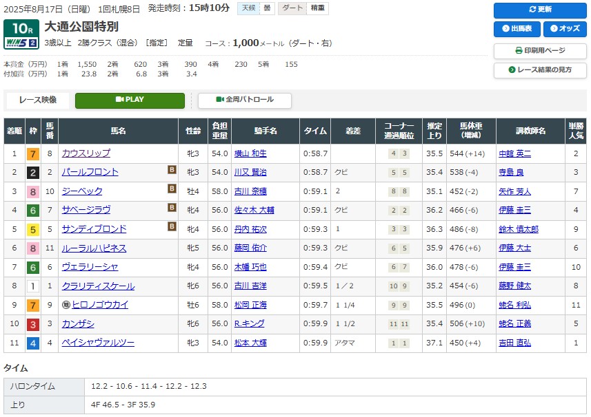 勝ったのは芝からダートに戻ってきたカウスリップ。両刀のロードカナロア産駒ということで気にはしていなかったが、ダ1000mで差し切る馬は強いと考えたパールフロントにまで勝ってしまった。