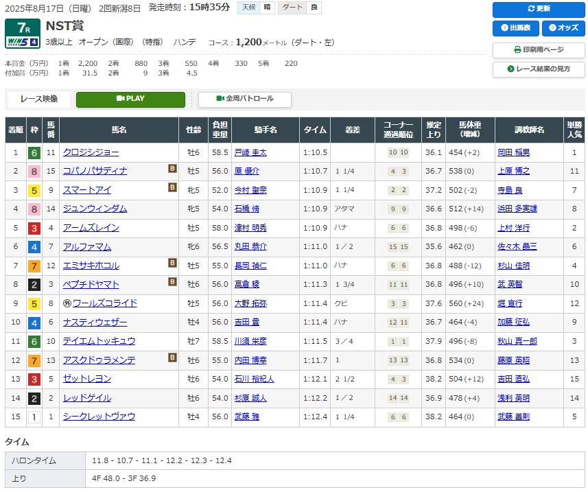 展開次第で楽勝もあるかと期待したテイエムトッキュウはコーナーワークの上手い馬だけに、シンプルな新潟コースが合わなかったかもね。それでも2番手からつついたスマートアイが3着なんだから負け過ぎか。