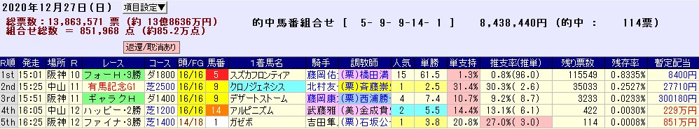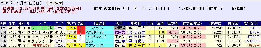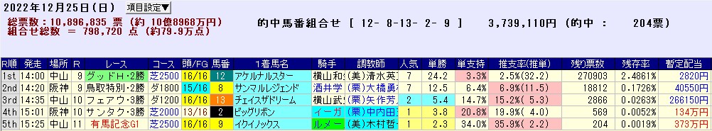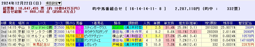 掟破りの土曜WIN5を発売した上に、日曜の有馬記念を2レース目に設定するという愚行を犯しながらも売上げは2日併せて20億円超えのぼろ儲け。