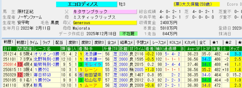 本馬の前走は単勝1.1倍のエコロディノスを退けての大金星。実際のところは、エコロに乗っていたモレイラが折り合いをつけられないまま控えるクソ騎乗で伸びを欠いたのが原因である。前進気勢の強い馬だから無理に引っ張ると気分を損ねて走らない。