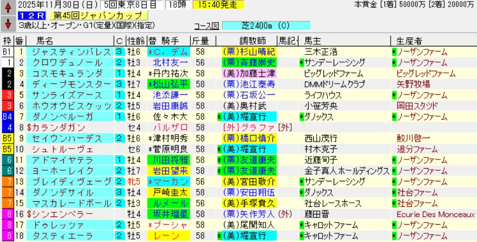 今年の目玉は、何といっても天皇賞・秋(G1)で初G1勝利を飾ったマスカレードボール、クロワデュノールとダノンデサイルといった新旧ダービー馬対決(タスティエーラを無視するな)、これに加えて近年最強といえる外国馬の刺客・カランダガンの参戦だろう。