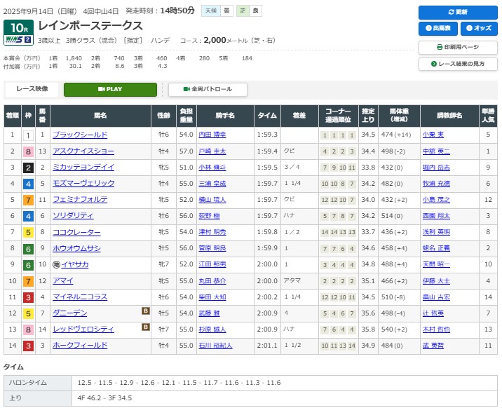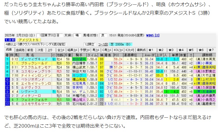 データで出した内田君の期待値そのままの結末に終わった。戸崎圭太ちゃんってのは、1番人気をよく飛ばすから、こういうタイミングは絶好のカモ。おそらく間に合わないで前に他の馬がいるとイメージしていたものの、ブラックシールドとは思わなかった。