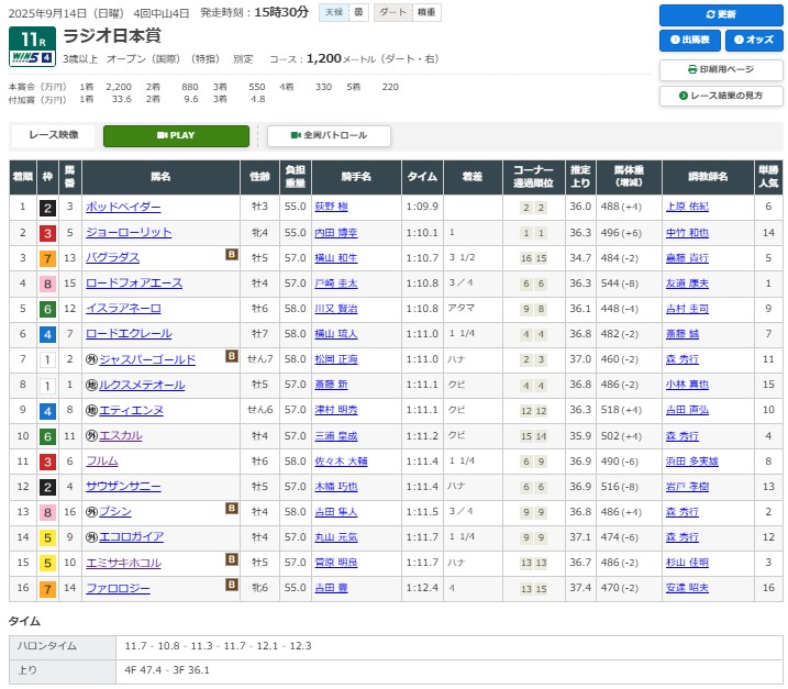 レースは前後半4F47秒3-44秒9(後傾2秒4)のスロー。おまえらいっつもチンタラやってんな。
