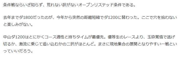 中山ダ1200ってのは良だと前が止まりやすく、湿ると相当速い時計で前が残るんだ。まあダートだから当たり前っちゃ当たり前だけど、この爆穴をイメージするには週末の天気も必要な条件だった。
