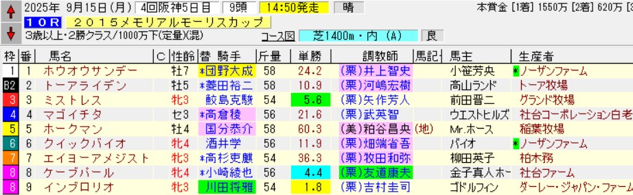 阪神10R2015メモリアルモーリスC(2勝)芝1400