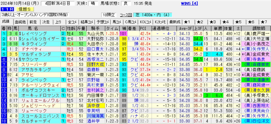 そのマルディランダの強敵が信越Sを快勝したレイベリング。残念ながらWIN5で勝つのが年に1回あるかないかの石橋脩というのは可哀想だが、今回は「運よく大外」に入ったのがいい。
