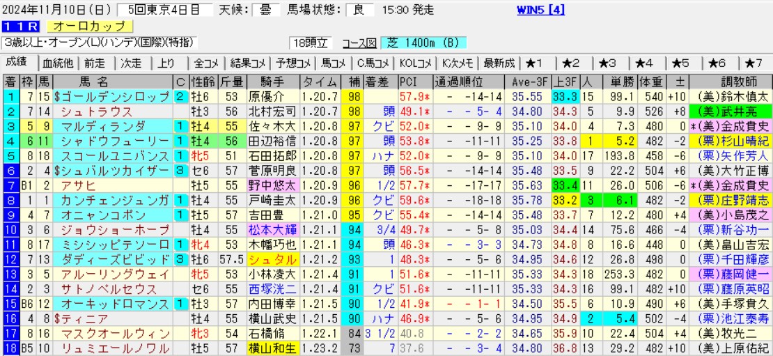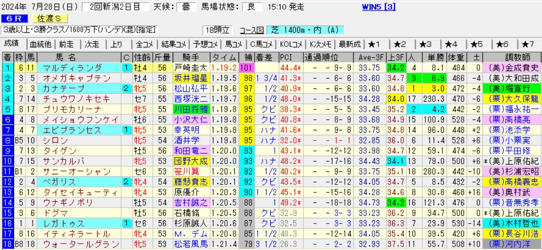 グレイイングリーンの安土城S(L)2着も馬券なら評価できるのだが、このWIN5常連の馬はずっと見てきたものの、善戦止まりで勝利にあと一歩届かないタイプ。最後に勝ったのも2022年10月の新春S(3勝)だった訳で、3年以上も勝てない姿を守り続けていた。穴でたまに来るので嫌いじゃないが、ここまでフォローする余裕はない。今夏全滅の7歳馬というのも割引だ。