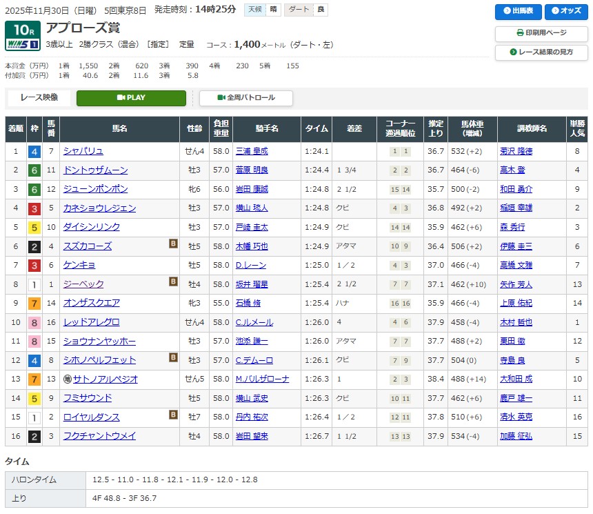 断然人気に推されたレッドアレグロが1分35秒7で楽勝していても不良のダート。遜色ない時計で走れるサノノワンダーに先着する力があったなら、シャパリュの評価も相対的に上がる。競馬は点と点じゃなく線で繋がっている。