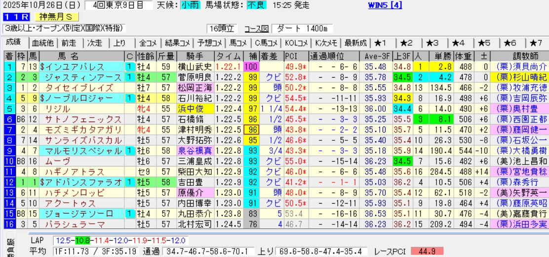 データ的にまたかと思ったのは、ひとつ前のアプローズ賞に乗っていた琉人と、このレースの雅の2人。琉人なんかデビューからWIN5未勝利だし、雅は福島で二桁人気取らせてもらったことはあっても、ここはトップクラスが集まるG1開催週の東京。人馬ともに荷が重かったか。