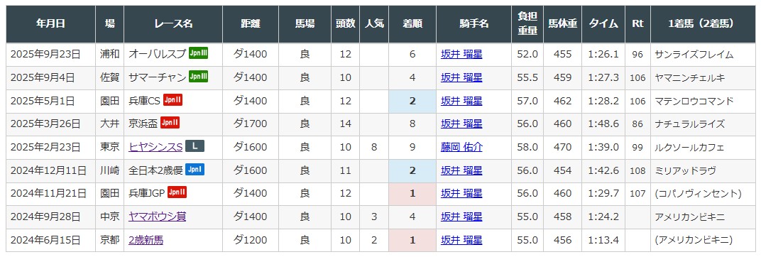 ※ダ1300の馬がダ1400使うと大抵このパターン。ホンの100m差でも割とスタミナを問われる。