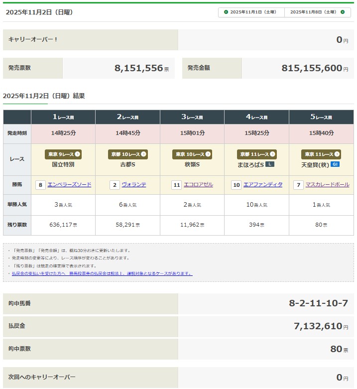 救いがあったとすれば、秋天の週で取り損ねた713万円は、当初マスカレ1点にしてエアファンディタを入れていた買い目を変更し、メイショウタバルと2点にした結果、点数がオーバーする関係で削って死亡した。これはオウンゴールの自滅だから、バカバカ俺のバカ!アホボケカスで狂い死んでいたけど、今回はその教訓を生かして徹頭徹尾マスカレ信者を貫いた。