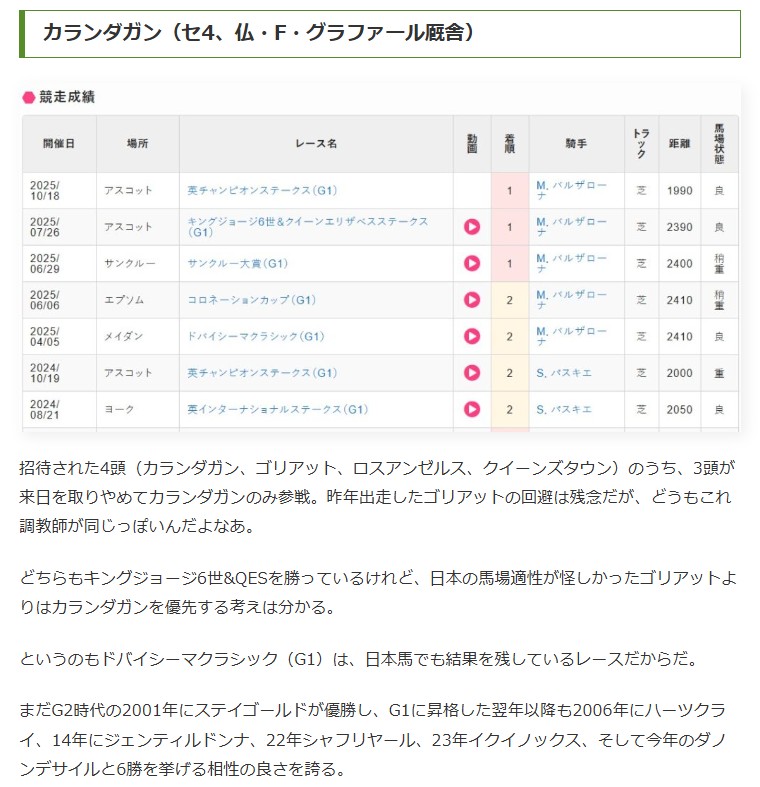 それは、戦績紹介の次に書いた「招待された4頭(カランダガン、ゴリアット、ロスアンゼルス、クイーンズタウン)のうち、3頭が来日を取りやめてカランダガンのみ参戦。昨年出走したゴリアットの回避は残念だが、どうもこれ調教師が同じっぽいんだよなあ。どちらもキングジョージ6世&QESを勝っているけれど、日本の馬場適性が怪しかったゴリアットよりはカランダガンを優先する考えは分かる」この部分だ。