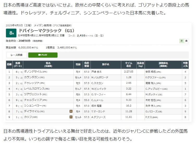 解説していた調教師さんもひとつひとつのパーツがしっかりしていると褒めていたのだが、私の感想は「日本馬といわれても分からないなこれ」というもの。ダノンデサイルが楽勝したドバイシーマクラシック(G1)はリアルタイムで観戦していたが、このときはデサイルに負けた馬くらいの印象しか残ってなかった。