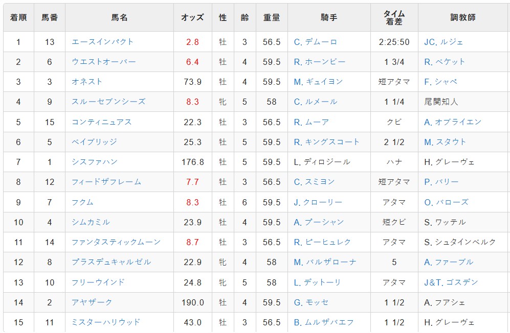 2分20秒3良の勝ちタイムは、数十年破られることがないと思えたアーモンドアイの世界レコード(2分20秒6良/18年)を0秒3も上回るスーパーレコード。普段から高速馬場を走っている日本馬ならまだしも、パワーとスタミナを要する欧州で好成績を残すフランスの馬がマークしたことに驚きを隠せなかった。