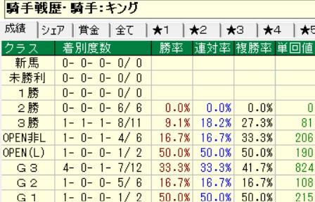 キングが素晴らしいところは条件戦より断然メインレースで活躍すること。平場なんかは回ってくるだけで勝てる馬に乗れば、騎手の腕に関係なく勝ててしまうけれど、騎手が上手くないと勝てないのが上のクラスである。