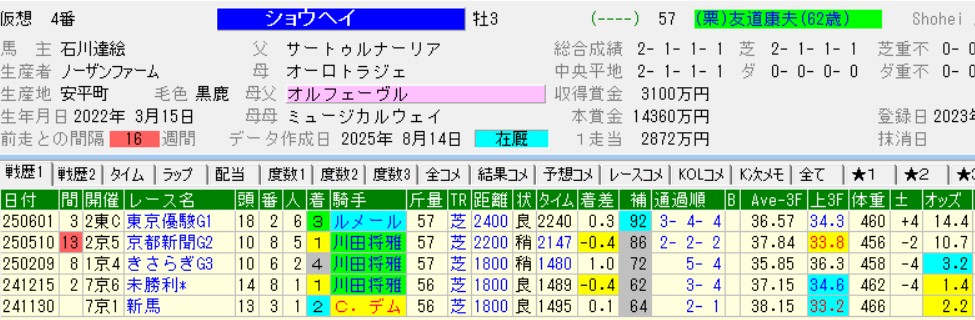 皐月賞(G1)で初めて後塵を拝した対ジョバンニでは、野路菊S(OP)と京都2歳S(G3)で立て続けに撃破。怖いのはむしろ川田が捨てたショウヘイの方かもしれない。