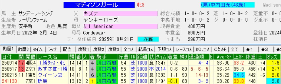 デビュー戦で差されたマディソンガールは、まだ1勝クラスで頭打ち(6着アルマデオロ)。未勝利勝ちの内容も評価できないとして、軽視したきさらぎ賞(G3)も2番人気で4着に敗れ、2着リンクスティップに3馬身差の楽勝をしたサトノシャイニングから6馬身以上離された。