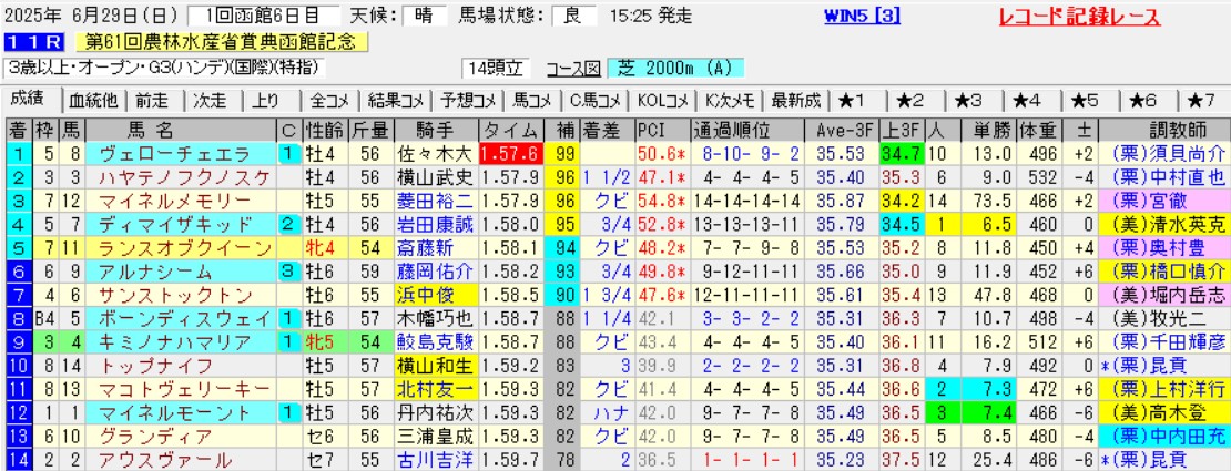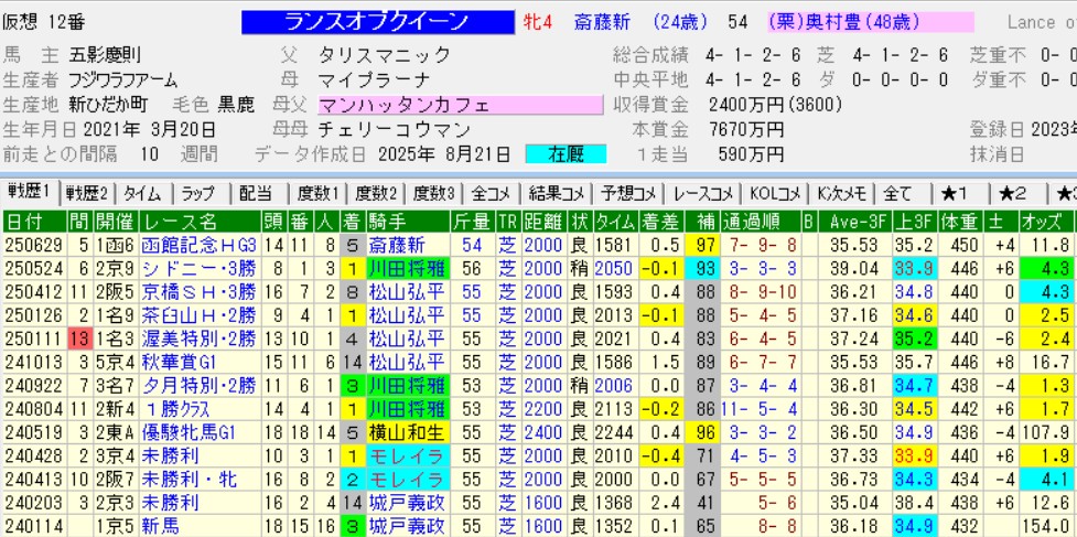 未知の魅力ならランスオブクイーンだろう。距離延長がプラスかどうかはわからないけど、一発のある斎藤新の騎乗は頼もしい。母父マンハッタンカフェは3歳夏の札幌で芝2600m戦を連勝した馬。母母チェリーコウマンというだけでも買いたくなる。函館記念(G3)で5着なら上等だ。