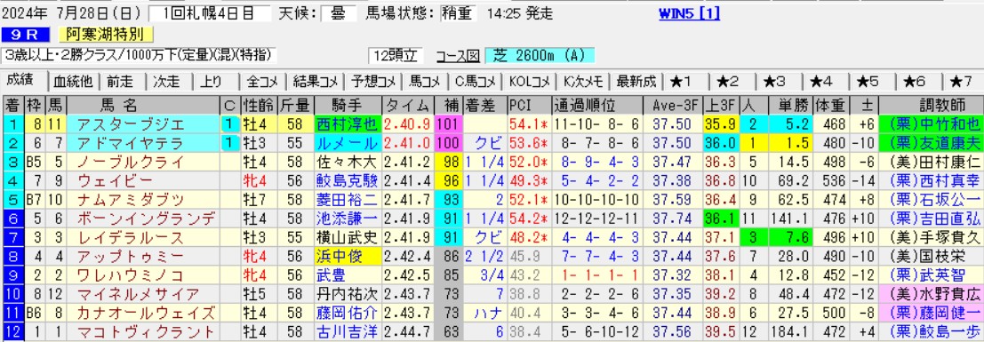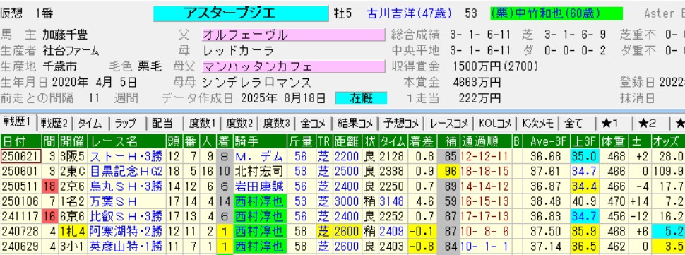 前走の札幌日経賞(OP)で自信を持って◎打った割に4着凡走。逃げたにもかかわらず、謙ちゃんがクソスローに落としすぎておかしな競馬をしていたっけ。ん?休み明けで息が入らなかったのなら一度使って前進もあるか。乗るのも松本君なら人気もなさそうだしなあ。