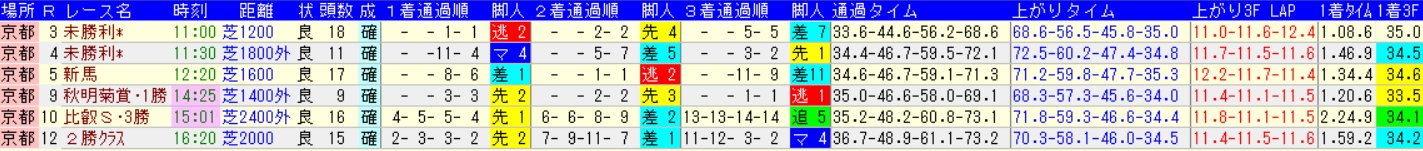 バカみたいな速い時計と上がりを要する東京に対し、10-11月の京都芝1600条件でそこまで極端なタイムも上がりも出ていない。