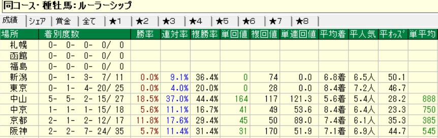 こちらはルーラーシップ産駒の競馬場別成績だが、新潟と東京は未勝利。そして、京都の芝1600においても未勝利が続いていたのだが、ソウルラッシュがデータブレイクをした馬である。