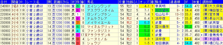便宜上、小倉2歳Sの過去10年を載せるけど参考程度。実際、中京開催の昨年は中京デビューの馬がワンツーフィニッシュを決めていた。