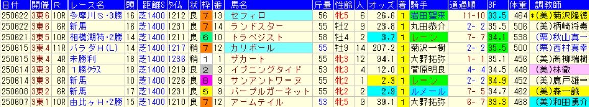 6月東京の芝1400mでデビュー勝ち。モーリス×コーディエライト(母父ダイワメジャー)の血統もなかなか。ダートの快速馬だったサウスヴィグラスの近親にあたる。