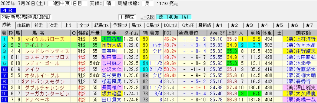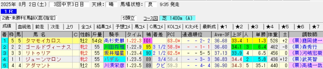 よってタマモイカロスのレースは額面通りに受け取れない過大評価となる可能性が高い。これならまだサバイバルラップを押し切ったマイケルバローズの新馬戦の方が厳しいレースをしていたのではないか。