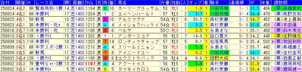 これはもう騎手の差だよなあ。今回は川田が新潟記念(G3)のクイーンズウォークに乗る関係で望来が代役。「上村厩舎×望来」の相性は「川田×中内田」に近く、相手がまた(1400の)団野君なら連勝も可能か。
