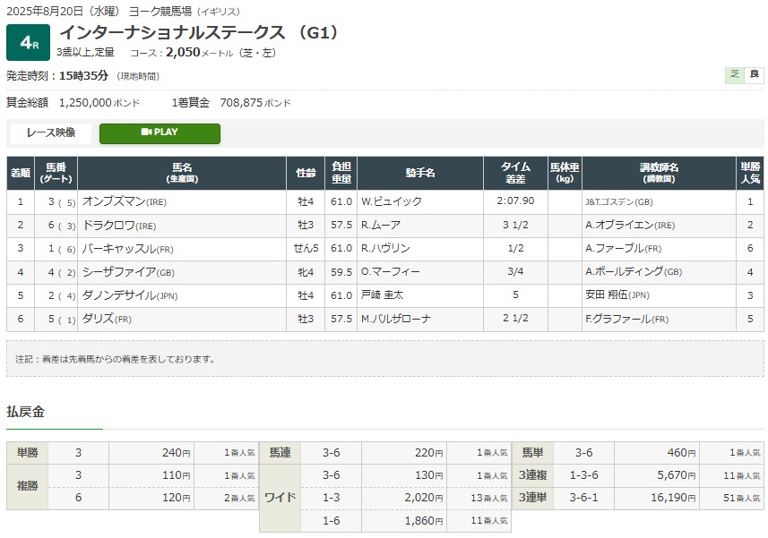 日本時間の水曜深夜に行われたインターナショナルS(G1)は、強烈な末脚を披露した1番人気オンブズマンが2着ドラクロワに3馬身半の差をつけて圧勝。前走のエクリプスS(G1)で不覚を取った借りを返すことに成功した。4.5キロあった斤量の差が3.5キロに減ったこともリベンジの背中を押したのだろう。