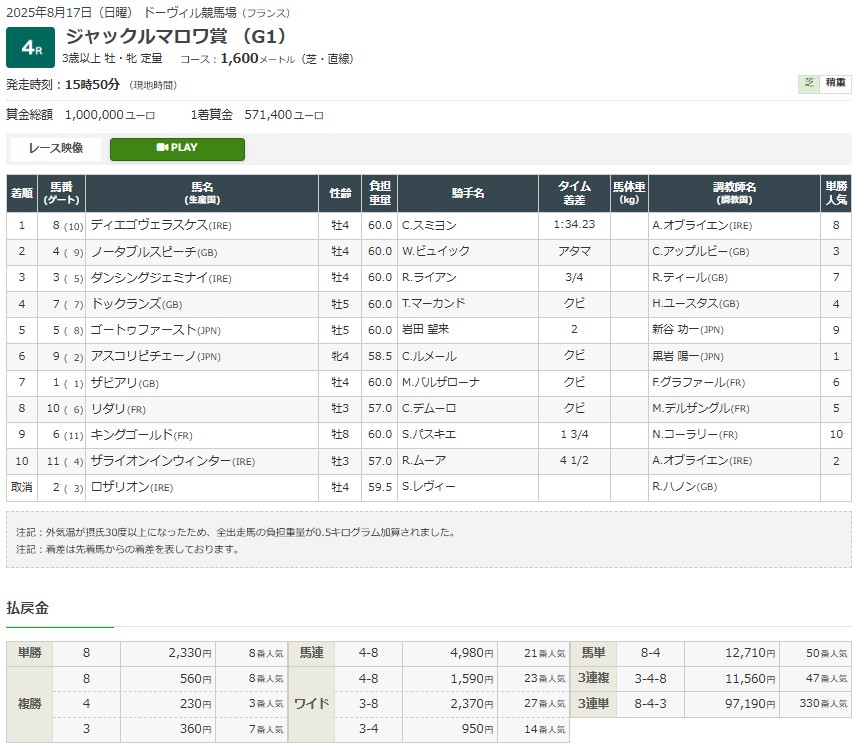 勿論、この嫌な予感は17日のジャックルマロワ賞(G1)でアスコリピチェーノが6着に凡走した直後だったことも無関係ではない。同日のギヨームドルナノ賞(G2)でアロヒアリイがラスト3Fを33秒12で駆け抜けて勝った事実があれど、過去の日本馬の歴史を思えばどちらがレアケースなのかは察しが付く。