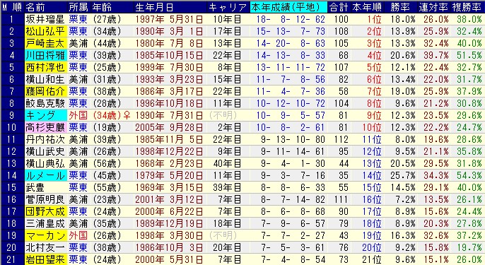 ルメールほどダートに特化した数字ではないものの、栗東で素質馬を独占している中でリーディングはまだ14勝で4位。ガシマン、松山弘平、戸崎圭太に後れを取っている。それを象徴するのが2着の多さだ。馬質の低い騎手の場合は穴馬を持ってきたと評価可能だが、勝ち負けする馬に乗っている騎手の2着が多いのは乗れていない証拠。これは上位騎手の顔触れを見ても察しが付く。某戸崎圭太君なんかまさにそう。そういう意味でもルメールの2着は少ない。