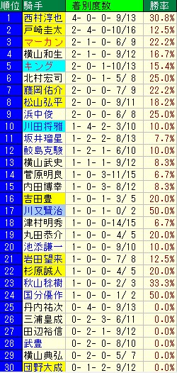 騎手 着別度数 勝率 連対率 複勝率 平均着 平人気