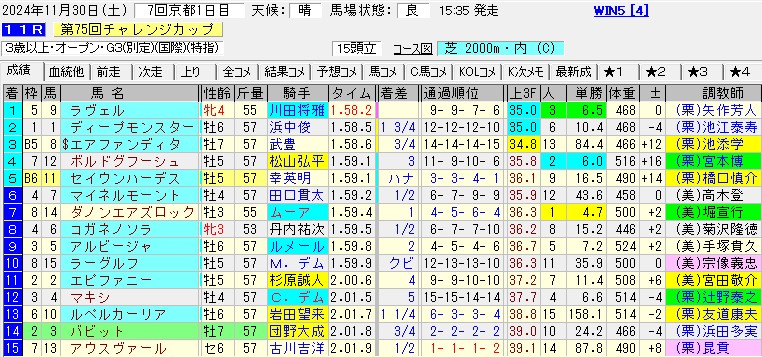 ポジションにしてもマイルのアルテミスS(G3)を勝っているだけに、ブレイディヴェーグのようなスピード不足で追走に苦しむことはなさそう。出走メンバーでジャパンC(G1)に通用するような馬もおらず、東京だけでなく京都も得意なルメールが乗るなら1点勝負もなくはない。