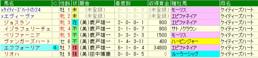 リンクスティップ一強の下馬評と思いきや、某キチガイ掲示板サイトで2番人気想定なのがこの馬。あーなるほど、エピファネイア産駒で母ケイティーズハートならエフフォーリアの半妹ってことね。
