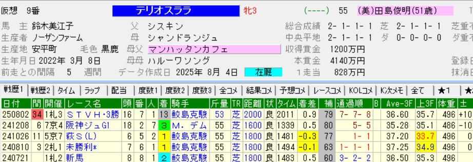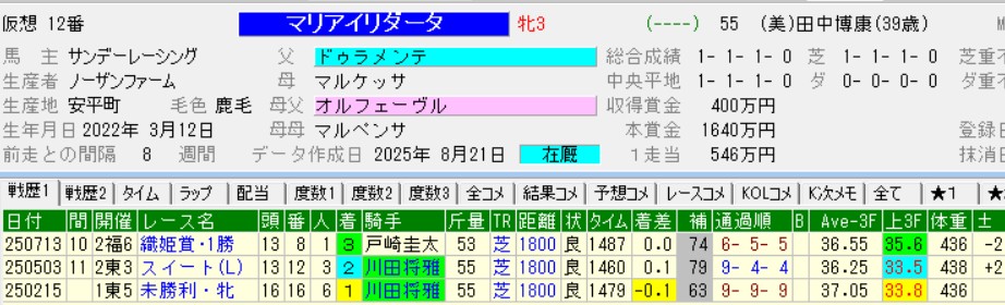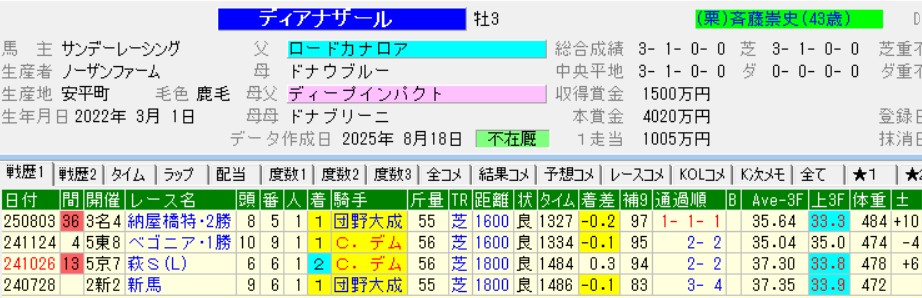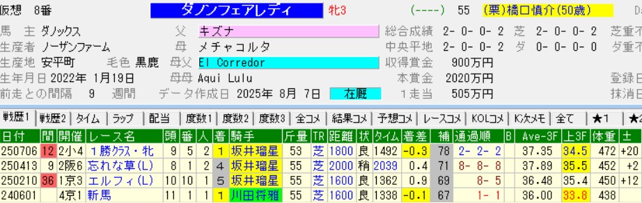 負かしたディアナザールは、その後に1勝クラスと2勝クラスを連勝。近親にジェンティルドンナやジェラルディーナのいる超良血馬らしい走りを見せている。