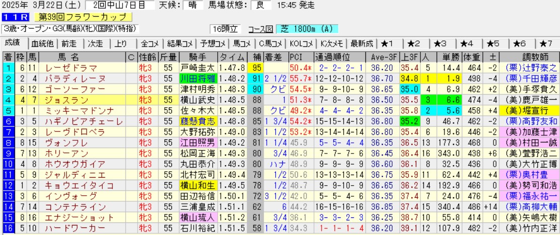 だから今年も土曜中山の馬場をチェックしないとどうしようもない。基本的に行ったままの前残りはクソなので、逃げ先行馬を中心に予想を組み立てるのがベターだろう。