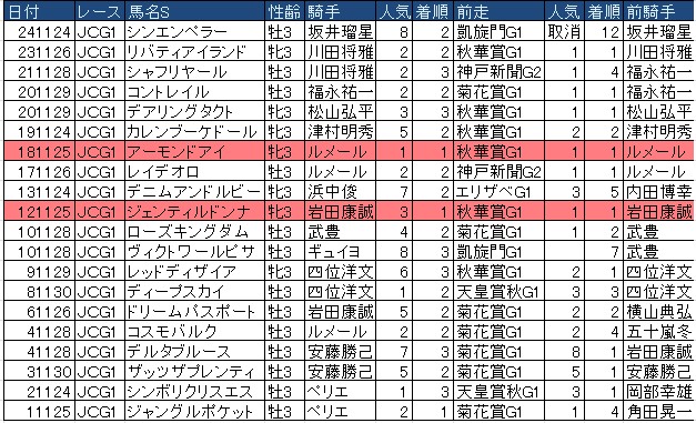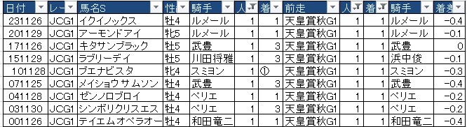少なっ(当然)。秋天からの連勝はナシ。秋華賞(G1)からの連勝は、いずれも三冠牝馬のアーモンドアイとジェンティルドンナ。菊花賞(G1)からの連勝もナシ。1番人気に支持される条件を考慮すればアーモンドアイに近いか。