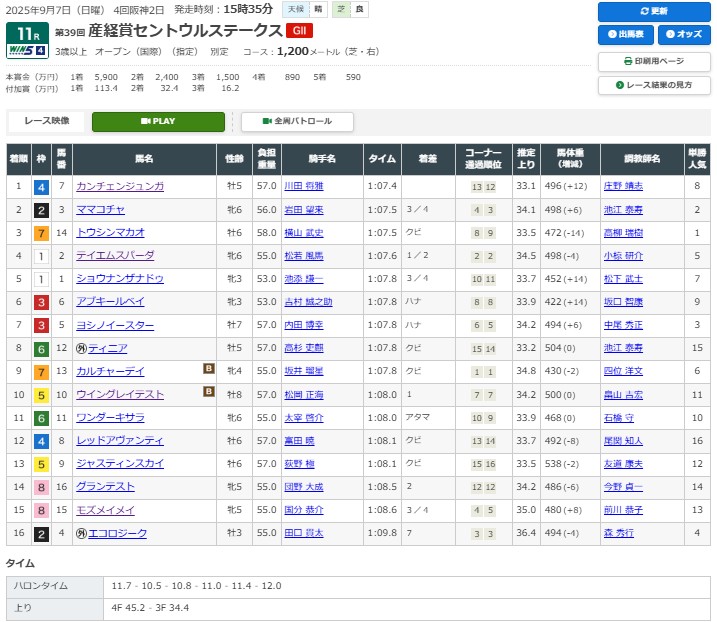日曜阪神11RセントウルS(G2)は、川田将雅の8番人気カンチェンジュンガが、G1級2頭を相手に大金星。スプリンターズS(G1)の有力候補として名乗りを上げた。